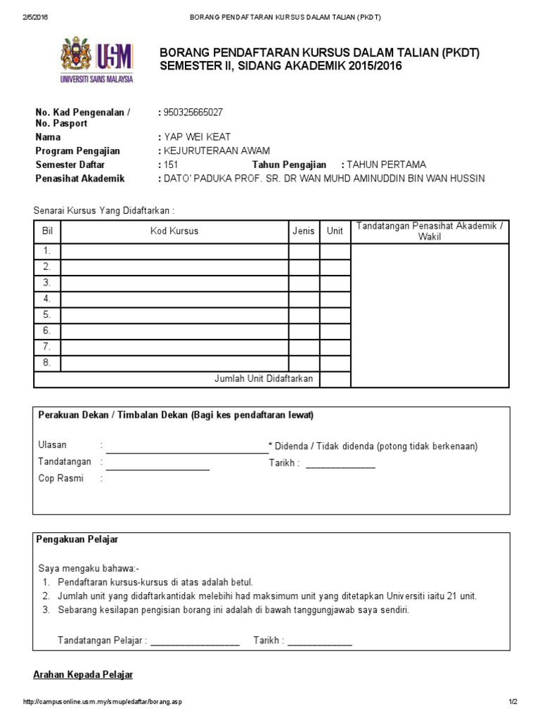 Borang pendaftaran kemasukan murid tahun 1 ambilan 2020 dan 2021 onlineperhatian buat ibu bapa penjaga yang ingin mendaftar anak ke sekolah rendah kerajaan. Contoh- tidak memaklumkan. Sila dapatkan kelulusan Dekan Fakulti sekiranya pendaftaran kursus melebihi 18 kredit ataupun Penasihat Akademik tidak bersetuju dengan pendaftaran kursus pelajar.